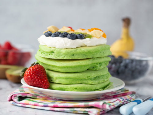 These wonderfully vibrant green pancakes get their colour from a healthy dose of spinach – there’s no food colouring in sight. They’re perfect for a savoury brunch and great for baby led weaning and toddlers. Can be vegan or vegetarian.